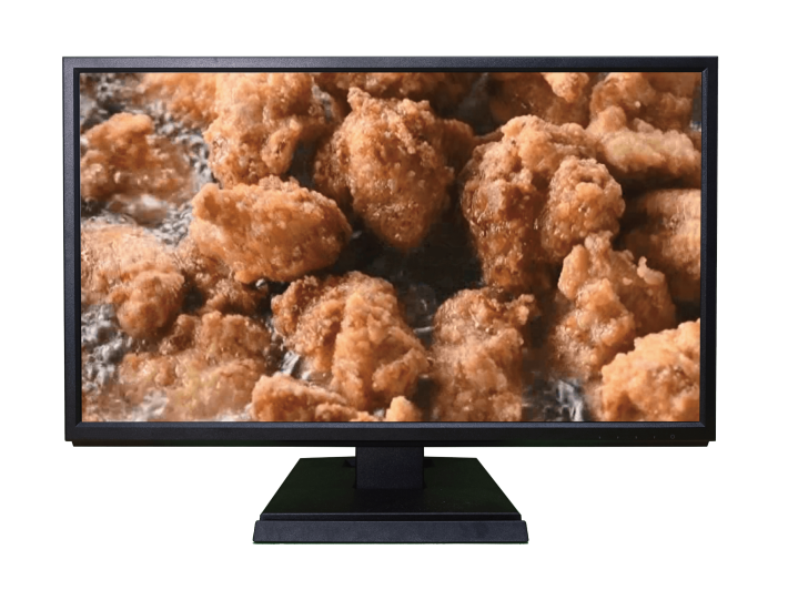 売場で不足する揚げたて感・出来立て感を補うために音とシズル映像を主体にした動画。